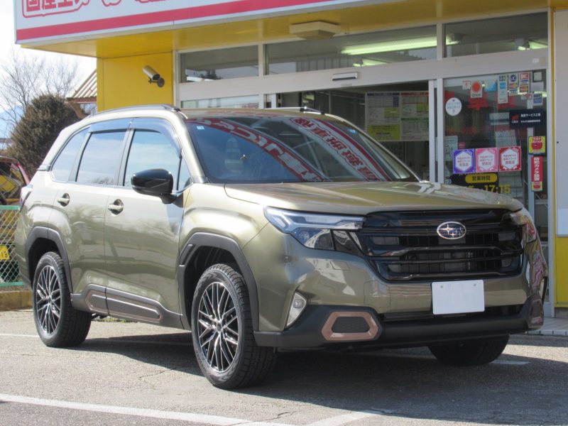 2026年2月現在、新車フォレスターの納期は4ヶ月程でございます。(注:ハイブリッド車はもう少し納期がかかります。)今回のフォレスターはグレード:スポーツEX の4WD車となります。カラーはオータムグリーン・メタリックになります。